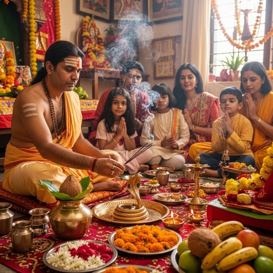 फल, पुष्प, दुग्ध, घी, वस्त्र, नाग-नागिन प्रतिमा, पूजा सामग्री और ब्राह्मण भोजन की व्यवस्था की जाती है।