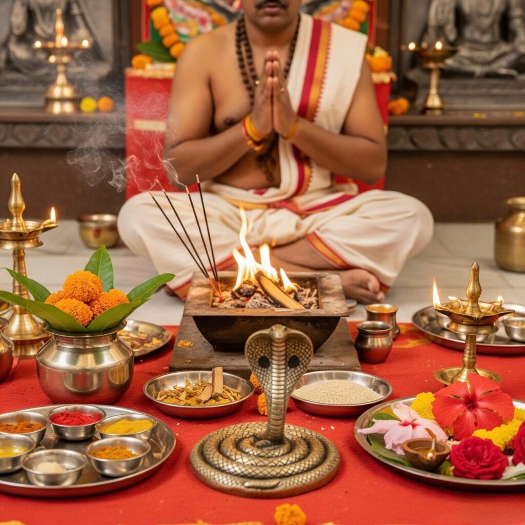 When all planets fall between Rahu and Ketu in a horoscope, this dosh is created. To counteract its influence, the Kaal Sarp Dosh Puja is performed according to ancient Vedic traditions with mantras, havans, and oblations to Lord Shiva and serpent gods.
